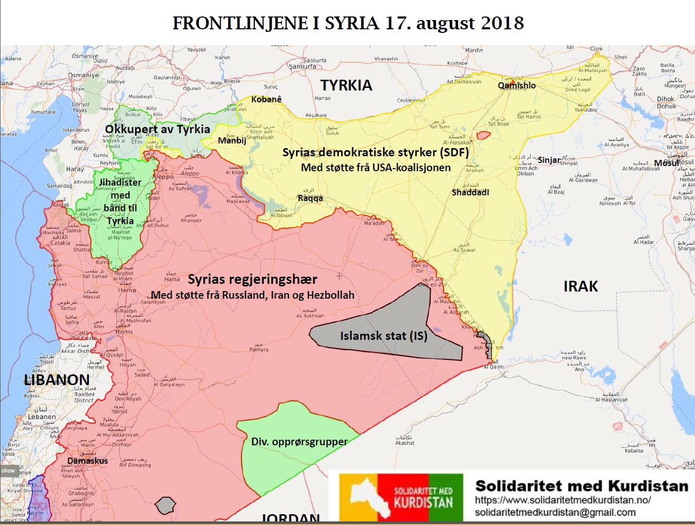 Samtidig fortsetter krigene. Her er kart over frontlinjene i Syria per 17. august 2018 her. (legger inn link). Tyrkia okkuperer et område nord-vest i Syria. Tyrkia har også egne styrker i Idlib-området (grønt på kartet) og sanarbeider tett med ulike jihadistgrupper som har kontrollen der.