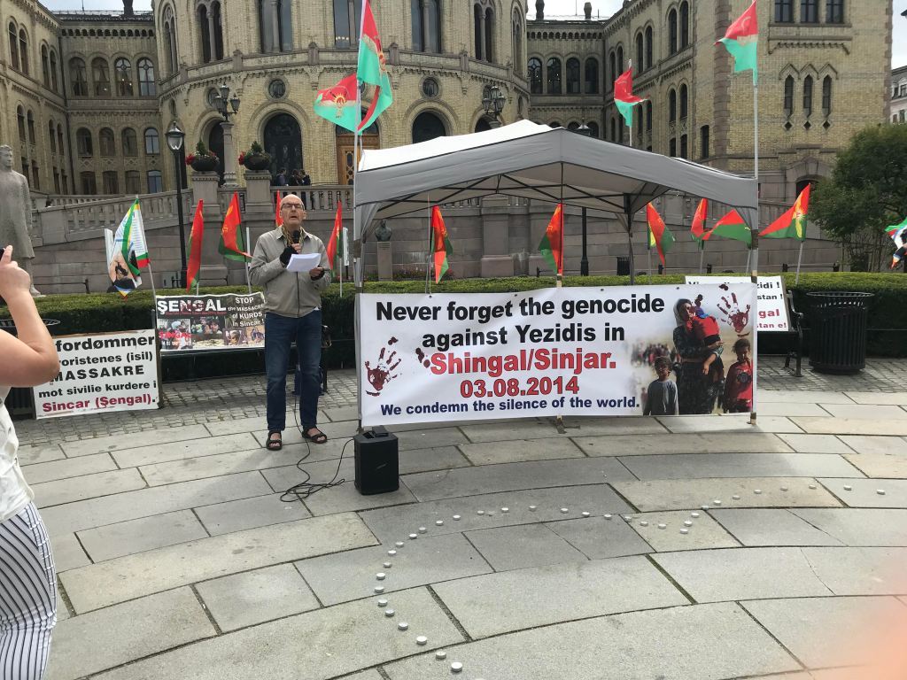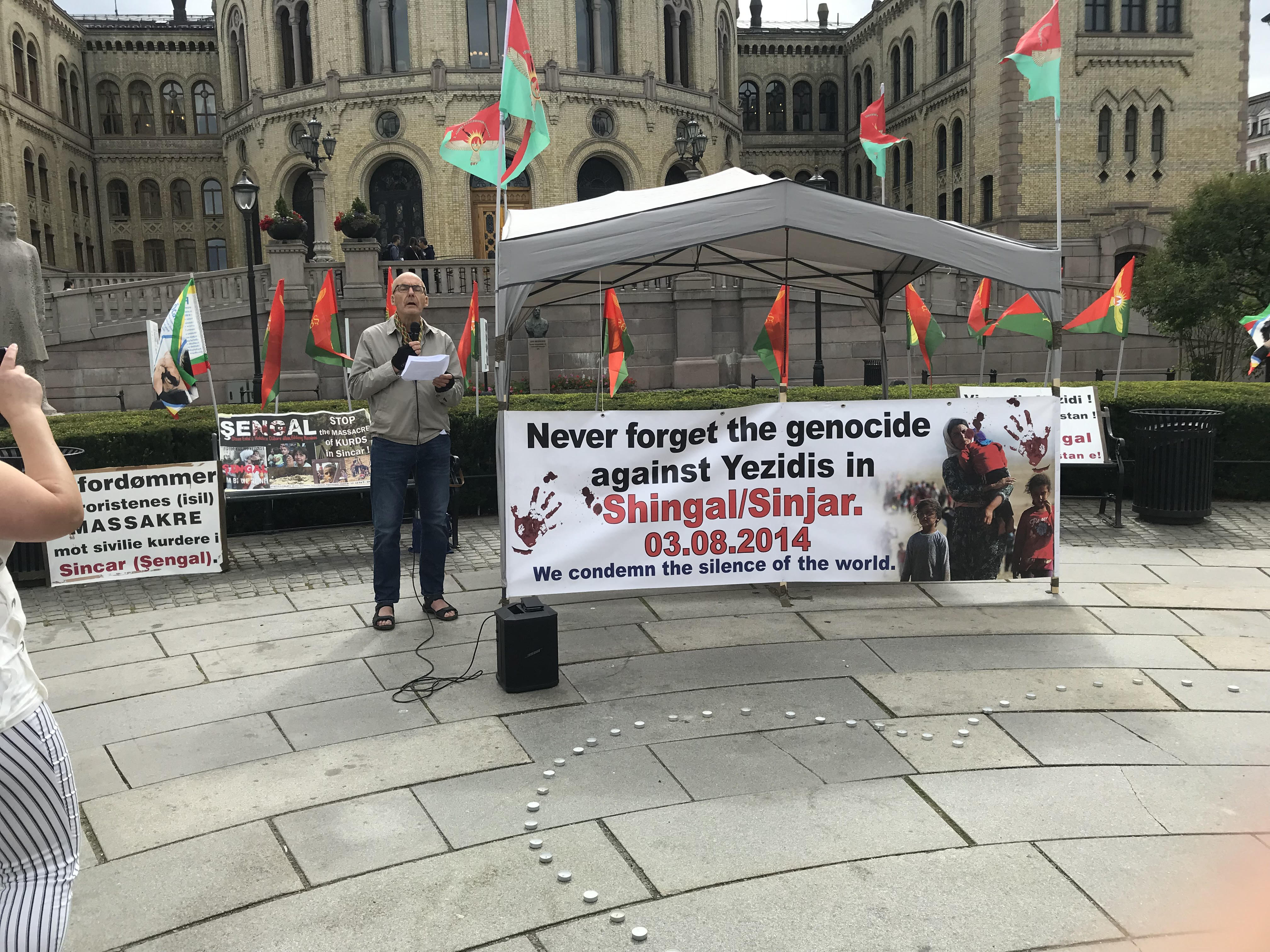 Landsstyremedlem i Solidaritet med Kurdistan, Erling Folkvord, holdt denne talen under en markering utenfor Stortinget 3. august 1993, på sjuårsdagen for IS-massakren i Shengal.