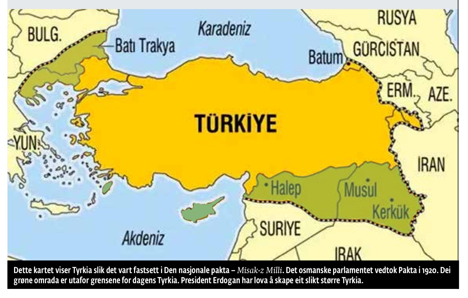 Det er snart 100 år sia Lausanne-konferansen. Sigerherrane frå den første verdskrigen avslutta da oppdelinga av Midt-Austen. General Mustafa Kemal Atatyrk, som grunnla den nye staten Tyrkia, måtte bite i graset og godta at England og Frankrike skulle kontrollere dei fruktbare og olje- og gassrike områda i Nord-Syria og Nord-Irak. Han måtte ta farvel med Stor-Tyrkia som han tre år tidlegare hadde skrivi inn i Den nasjonale pakta, på tyrkisk: Misak-ı Millî. Pakta, som sigerherrane avviste, seier at Nord-Syria og Nord-Irak er ein del av Tyrkia.