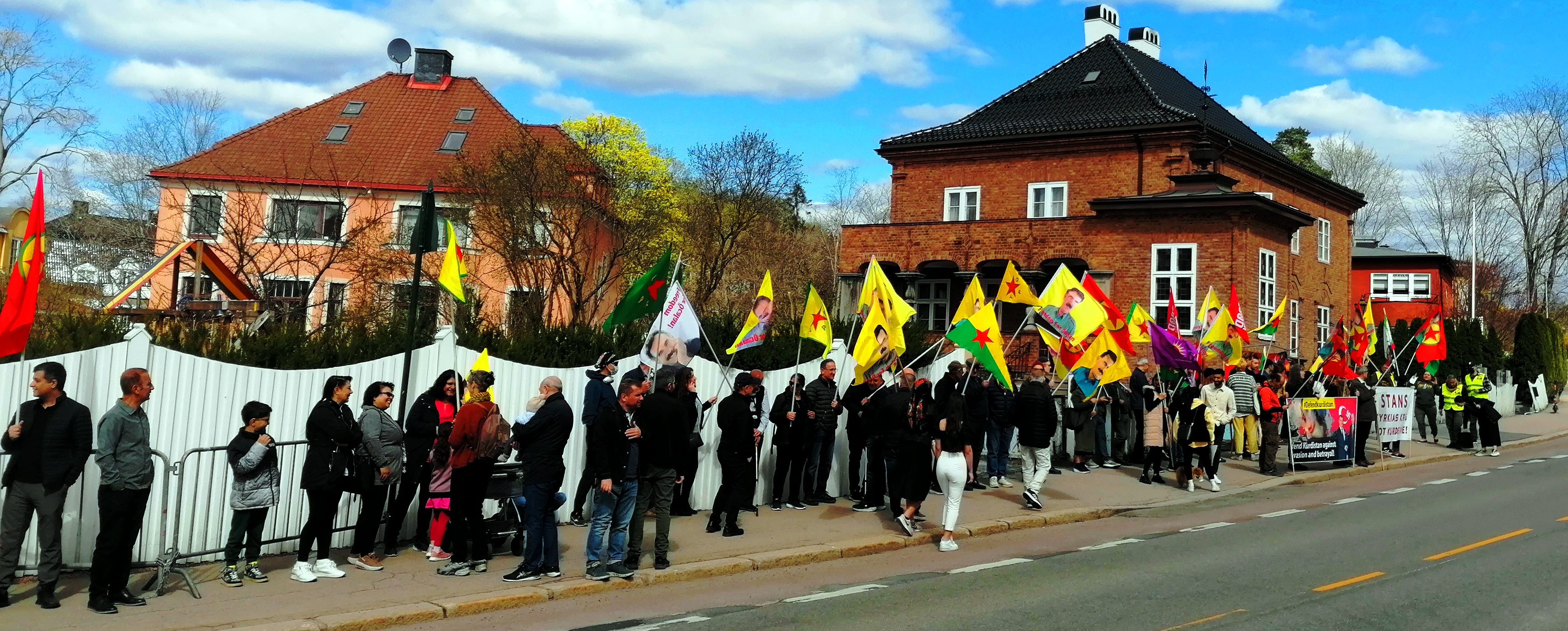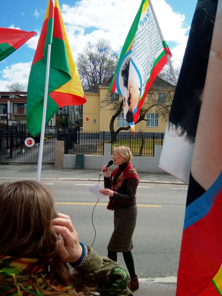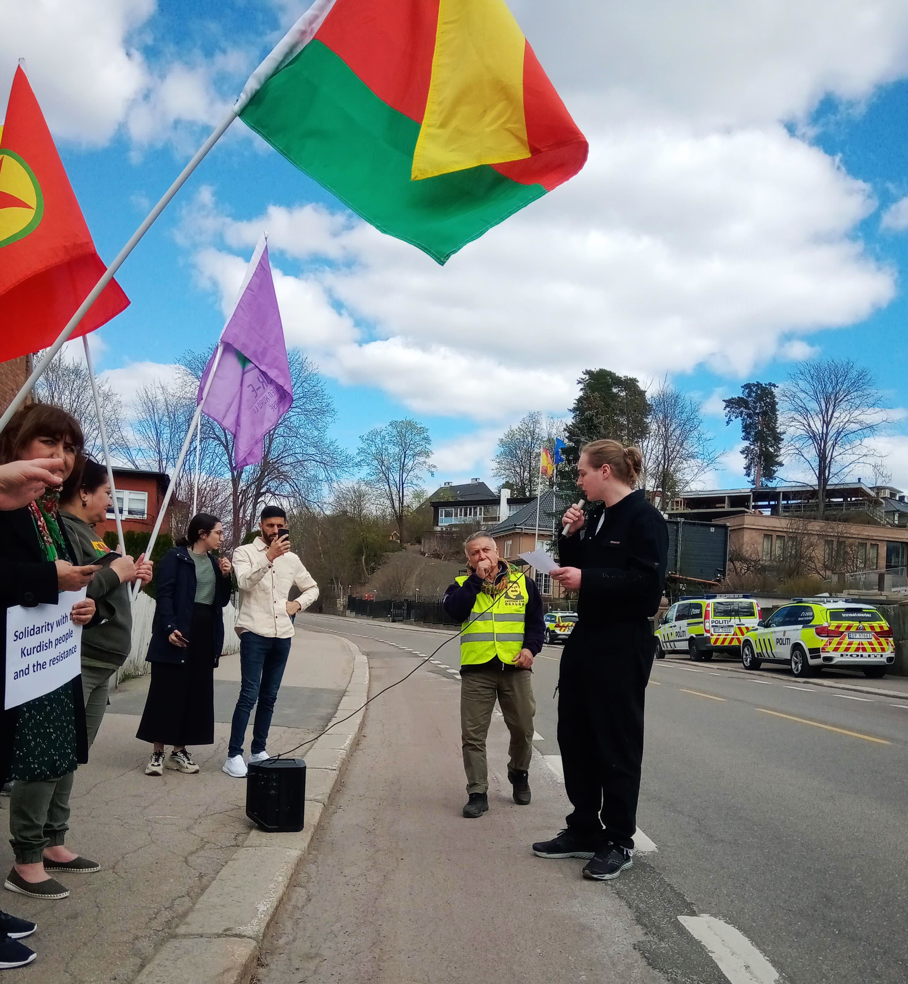 I Oslo i dag demonstrerte over 50 utenfor den tyrkiske ambassaden i Oslo. Blant appellantene var representanter for Rød Ungdom, MDG, Rødt og Kurdisk demokratisk samfunn.