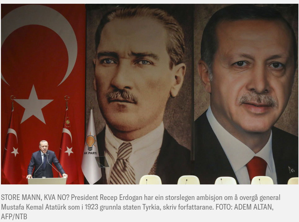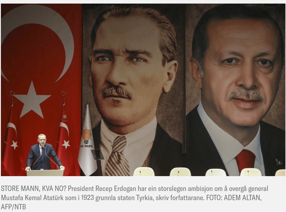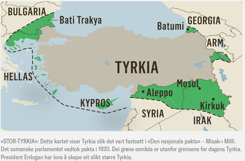 På vegner av Tyrkia har Erdogan ambisjonar. Han vil bli større enn general Mustafa Kemal Atatyrk som i 1923 grunnla staten Tyrkia. Det året gjekk Atatyrk på eit audmjukande nederlag på Lausanne-konferansen. Der avslutta sigerherrane frå den første verdskrigen oppdelinga av Midt-Austen. Atatyrk fekk ikkje det Stor-Tyrkia som han tre år tidlegare hadde skrivi inn i Den nasjonale pakta. (Sjå kartet.) England og Frankrike ga ikkje frå seg kontrollen over dei olje- og gassrike områda i Nord-Syria og Nord-Irak. Erdoğans ønskje om revansj er no ein viktig årsak til invasjonane i Syria og Irak.