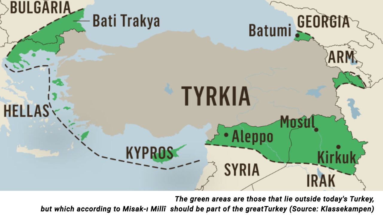 For sitt heime-publikum har president Recep Tayyip Erdoğan holdt mange taler som ikke er nevnt i europeiske medier. Han har lovet sine velgere å skape Det større Tyrkia som Atatürk ikke klarte å oppnå. Når mediene er tause, er det lettere for andre statsledere å late som om de ikke vet at Erdoğans brudd på folkeretten er en del av en overordna strategi.