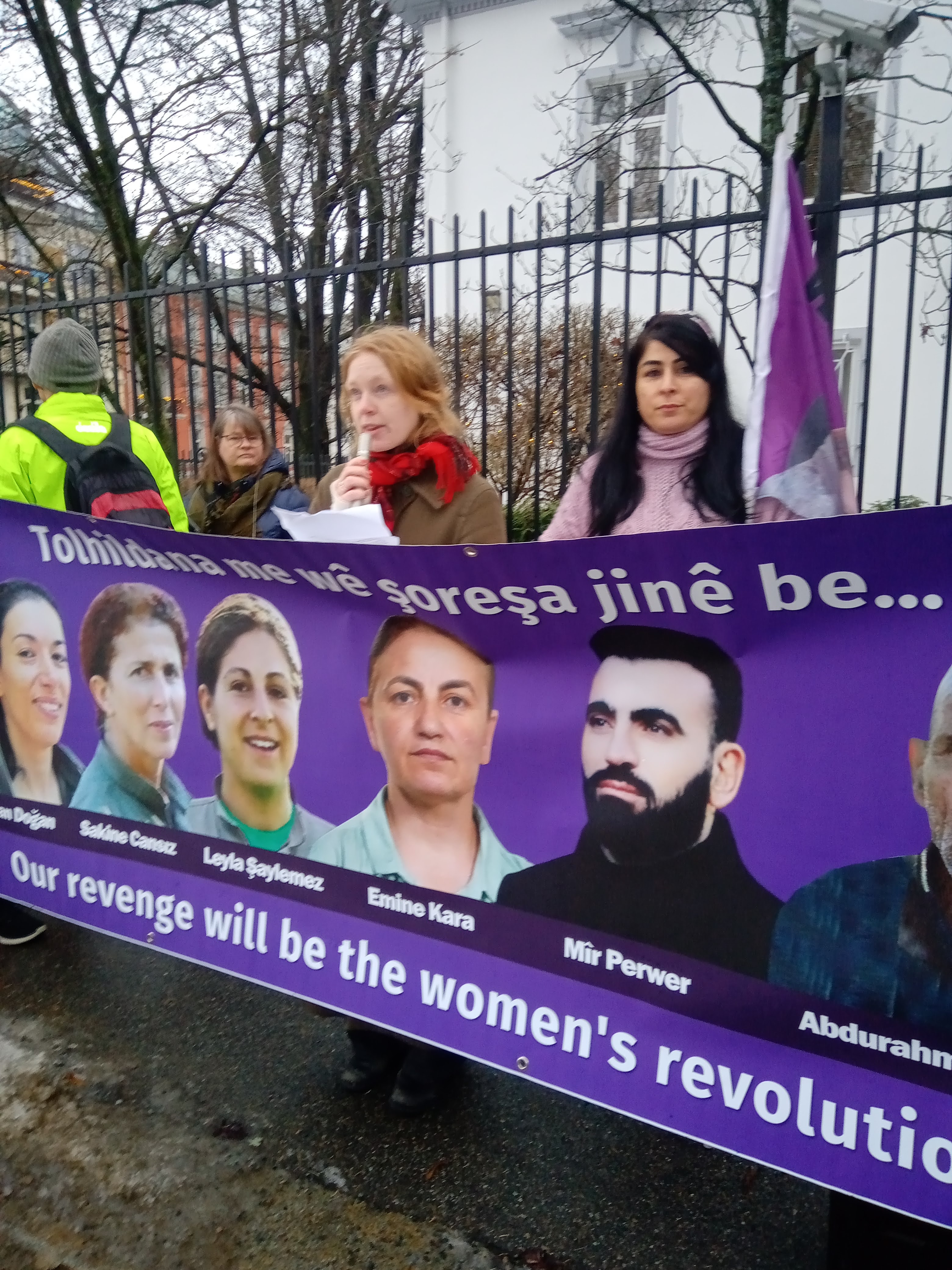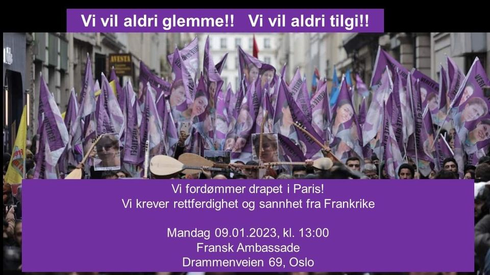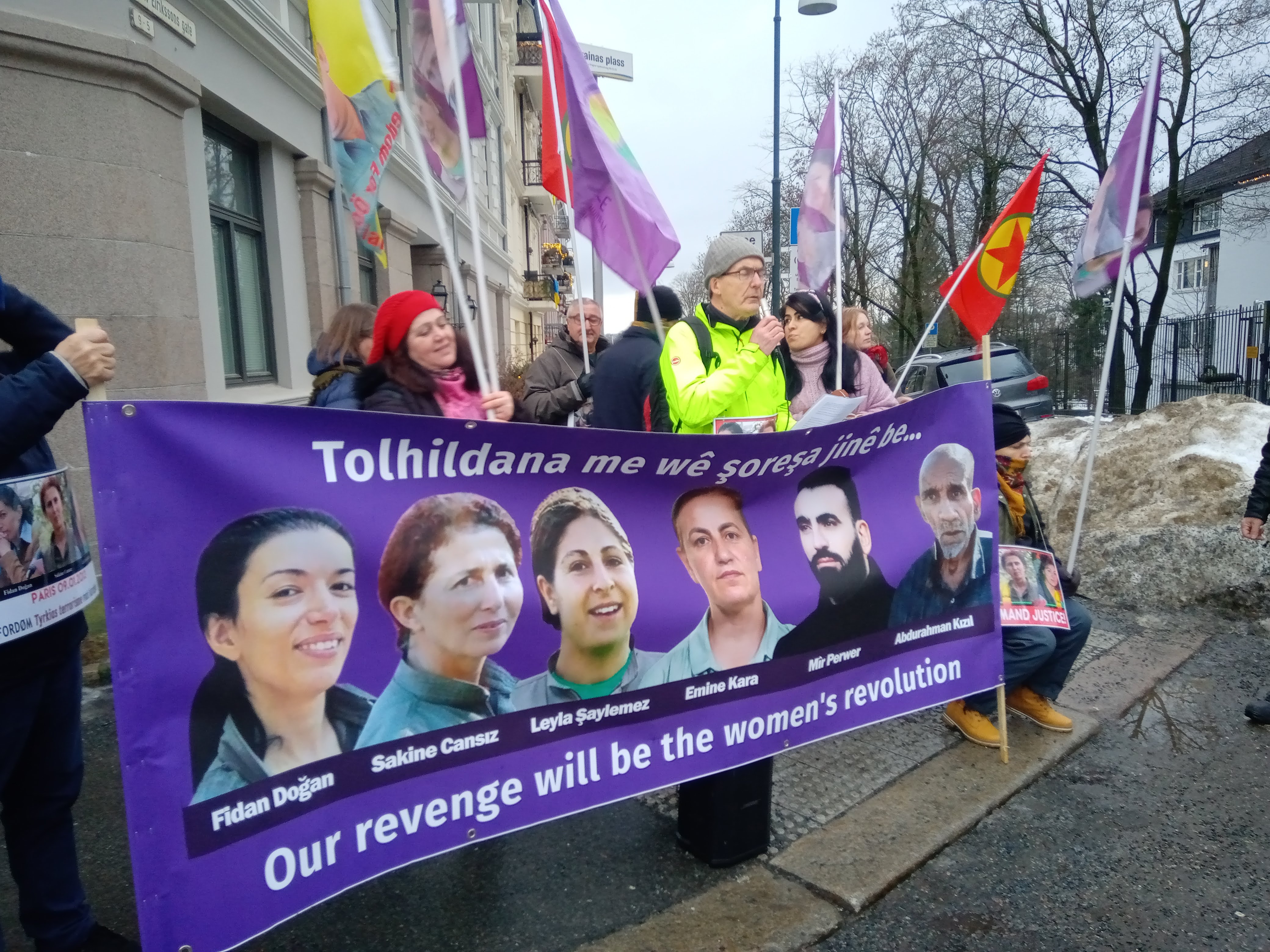 I dag er det ti år siden Sakine, Fidan og Leyla ble myrda i Paris. Drapene på de tre feministene var et angrep på alle feminister og et forsøk på å bli kvitt dem som aktivt vil kjempe for kvinner og kurdere sin frihet. Og mange flere kvinner enn de har blitt utsatt for vold og drap over mange år. På lille julaften skjedde det igjen. Tre kurdiske aktivister ble brutalt myrdet i Paris. Evin Goye var en av de. Hun har vært aktiv for den kurdiske frihetsbevegelsen i mange år og var sist representant for den kurdiske kvinnebevegelsen i Frankrike. Hun var en pådriver for kurdiske kvinner sin frigjøringskamp. Nå krever vi rettferdighet og sannhet fra Frankrike! Og vi krever handling mot den fascistiske staten Tyrkia for å få stans på det brutale folkemordet mot kurdere som har pågått i lang tid og fortsatt pågår. Når Sverige aksepterer en hestehandel med kurdiske politiske flyktninger for å bli medlem i angrepsalliansen NATO, er det et klart tegn på at noe er alvorlig galt.
