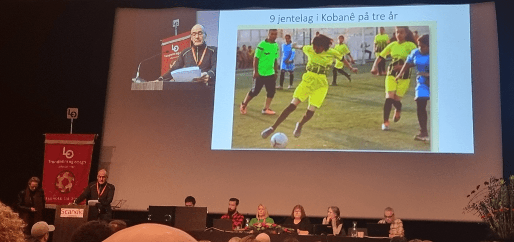 Den siste helga i januar arrangerer LO i Trondheim en konferanse hvert år. På konferansen stilte Foreningen fotballbaner for jenter og gutter i Kobanê, Raqqa og Qamishlo med løpeseddel og fikk holde en appell for over 500 deltakere om hvorfor det er viktig å støtte barnefotballen i Qamishlo. Særlig med tanke på jenter. I Kobanê har det gått fra null til ni jentelag siden de fikk to kunstgressbaner for barn i 2018.