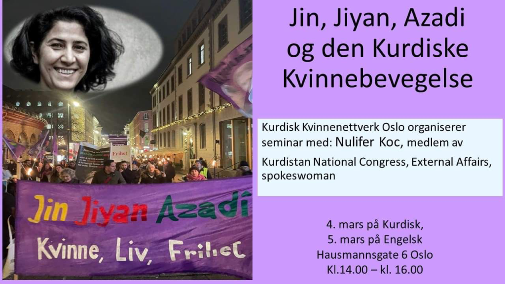 I forbindelse med internasjonale kvinnedagen arrangerer Kurdisk Kvinnenettverk i samarbeid med Solidaritet med Kurdistan et seminar om Jin, Jiyan, Azadi og den kurdiske kvinnebevegelsen.