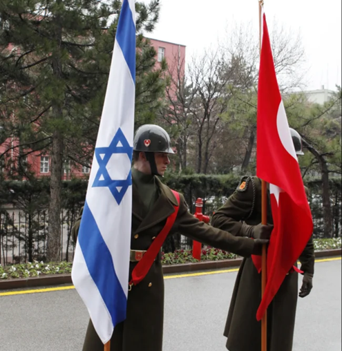 Det nære forholdet mellom regjeringen i Tyrkia og Israel er forankret i de aller første årene av Israels etablering. Tyrkia var den første Midtøsten-regjeringen som anerkjente Israel i 1949. Siden den gang har det strategiske forholdet mellom de to fortsatt til i dag. Innenfor rammen av sin «periferi-doktrine», har Israel siden etableringen forsøkt å utvide alliansen med Tyrkia, inkludert å motvirke «pan-arabisme». Viktige militære partnerskap har utviklet seg gjennom årene, inkludert luft-, sjø-, land- og etterretningssamarbeid, utvikling av fly, våpen og missiler, gjensidig trening og øvelser. Det er verdt å nevne at israelske luftvåpenpiloter har blitt trent i Tyrkia innenfor rammen av fellesøvelser med tyrkiske styrker. Til tross for overflatefriksjoner, spesielt etter Mavi Marmara-saken [i] som skadet et visst nivå av diplomatiske forbindelser, stoppet aldri forholdet mellom disse regjeringene og økonomiske utvekslinger utvidet seg selv da de hadde toppet verbale konflikter til tider. De ulike NATO-basene i Tyrkia har vært svært viktige for vestlig imperialisme i Midtøsten, først mot Sovjetunionen, og senere for intervensjonen etter 11. september innenfor rammen av den såkalte «Anti-terror_krigen». Blant disse basene er Incirlik [ii] militærbase rapportert å bli brukt til å støtte den israelske hæren i dens nåværende invasjon av Gaza.