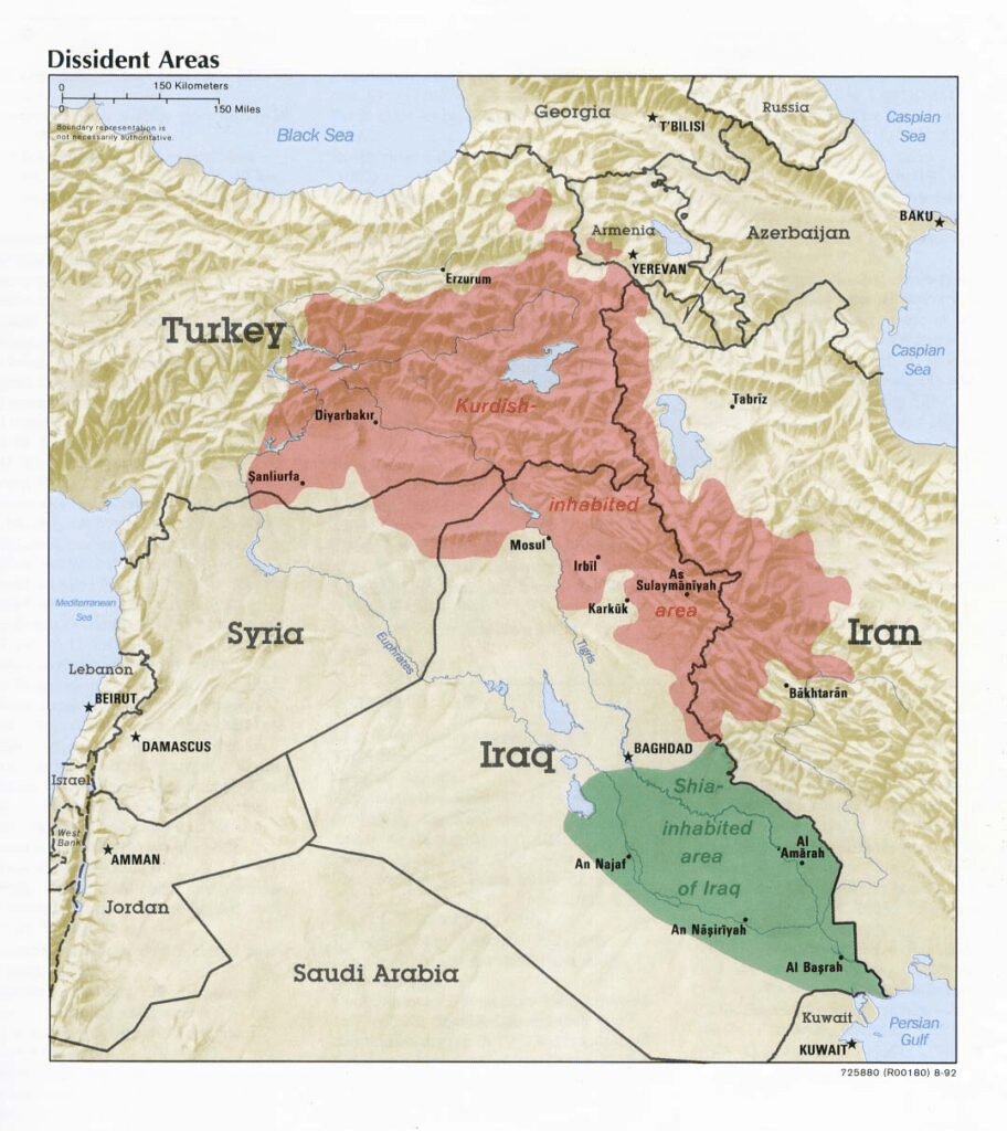 Det omfatter Kirkuk, Mosul og Sleimani (Suleimania), men går klar av Barzanistan, KDP-områdene med sete i Erbil.