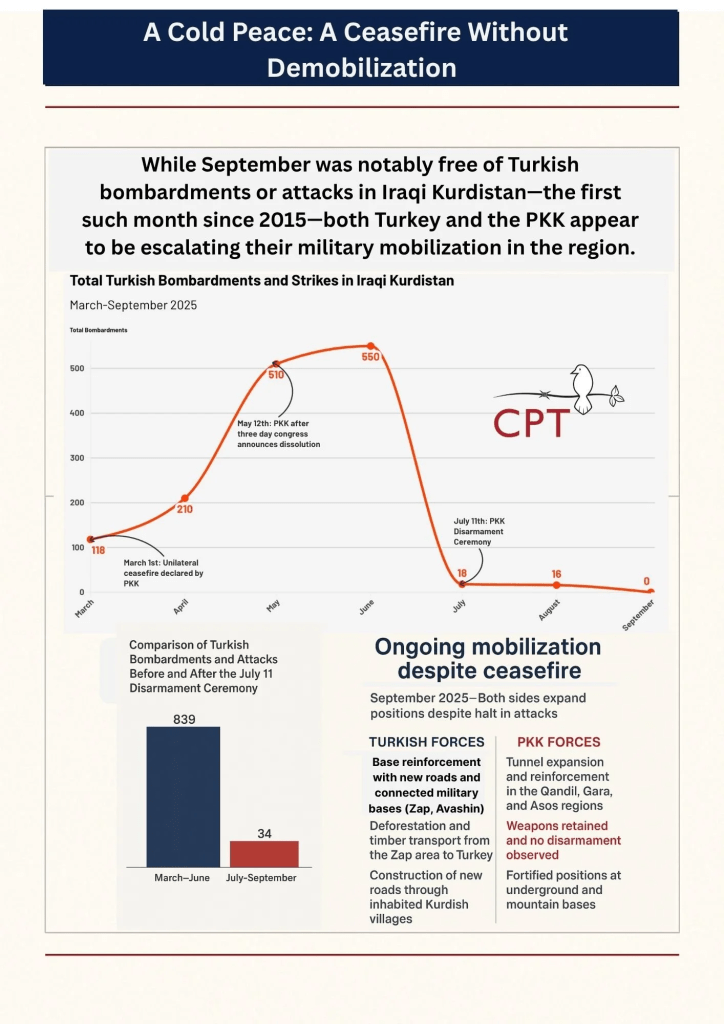 Bak denne tilsynelatende stillheten skjuler det seg likevel en ny form for spenning. Både Tyrkia og PKK har brukt våpenhvilen til å styrke sine militære posisjoner. Tyrkia har utvidet og befestet baser, bygget nye veier fra militære installasjoner inn mot landsbyer og fraktet inn nytt utstyr. PKK på sin side har forsterket og utvidet sitt nettverk av tunneler og fjellposisjoner, og ingen av partene har tatt reelle skritt mot nedrustning.