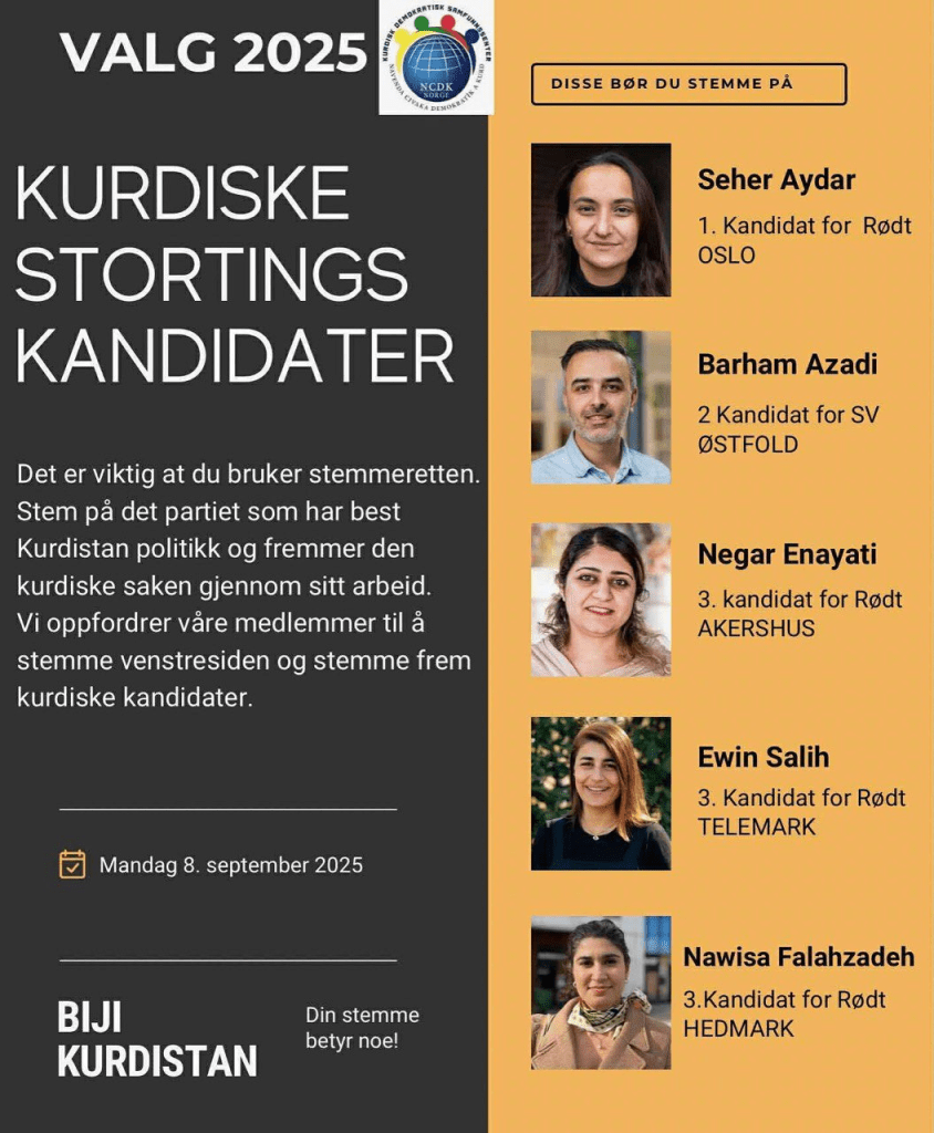 Valgdagen er mandag 8. september – og din stemme betyr noe. Ved å delta i valget kan du være med å styrke partier og kandidater som løfter fram den kurdiske saken og jobber for et mer rettferdig samfunn. Solkurd oppfordrer også alle til å stemme på venstresiden og støtte kurdiske kandidater som stiller til valg.