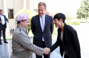 Bilde t.h.: Tidligere utenriksminister Børge Brende på offisielt besøk hos Mesoud Barzani, i aug. 2015, etter at presidentperioden hans var slutt, men nektet å gå av. Litt pinlig da kurdere i Norge påpekte «feilen», at han behandla en illegal president på denne måten. Bilde t.v.: Brende, Søreide og Barzani i 2016.